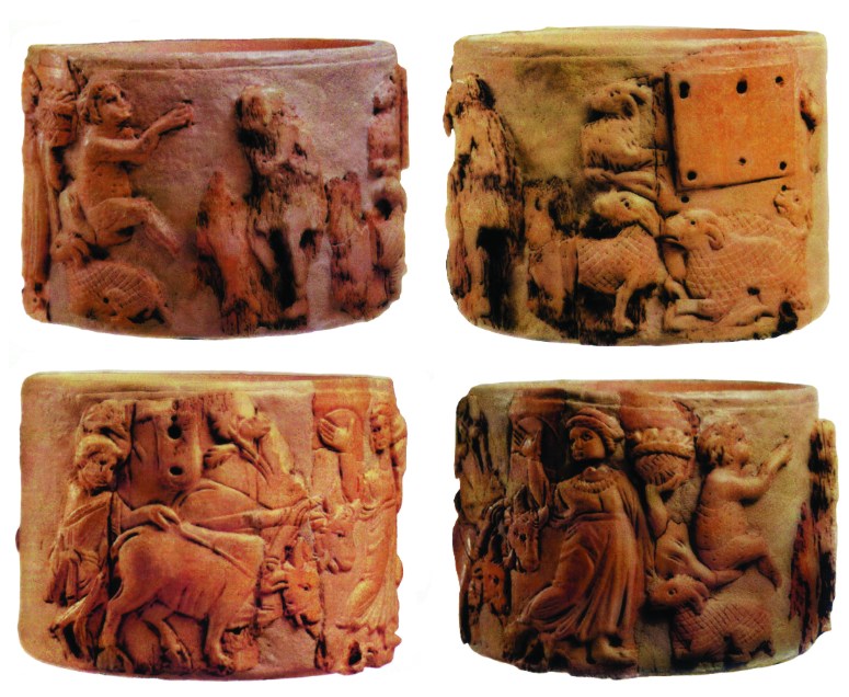 Pyxida bola poskladaná do tvaru valcovitého plášťa. Jej výzdoba realizovaná v nízkom reliéfe je tvorená výjavom oráča s dobytčím záprahom a kráčajúcej ženy s košom obilia. V bukolickom výjave medzi odpočívajúcim stádom oviec a kôz dominujú postavy sediaceho mladého a prichádzajúceho starého pastiera.